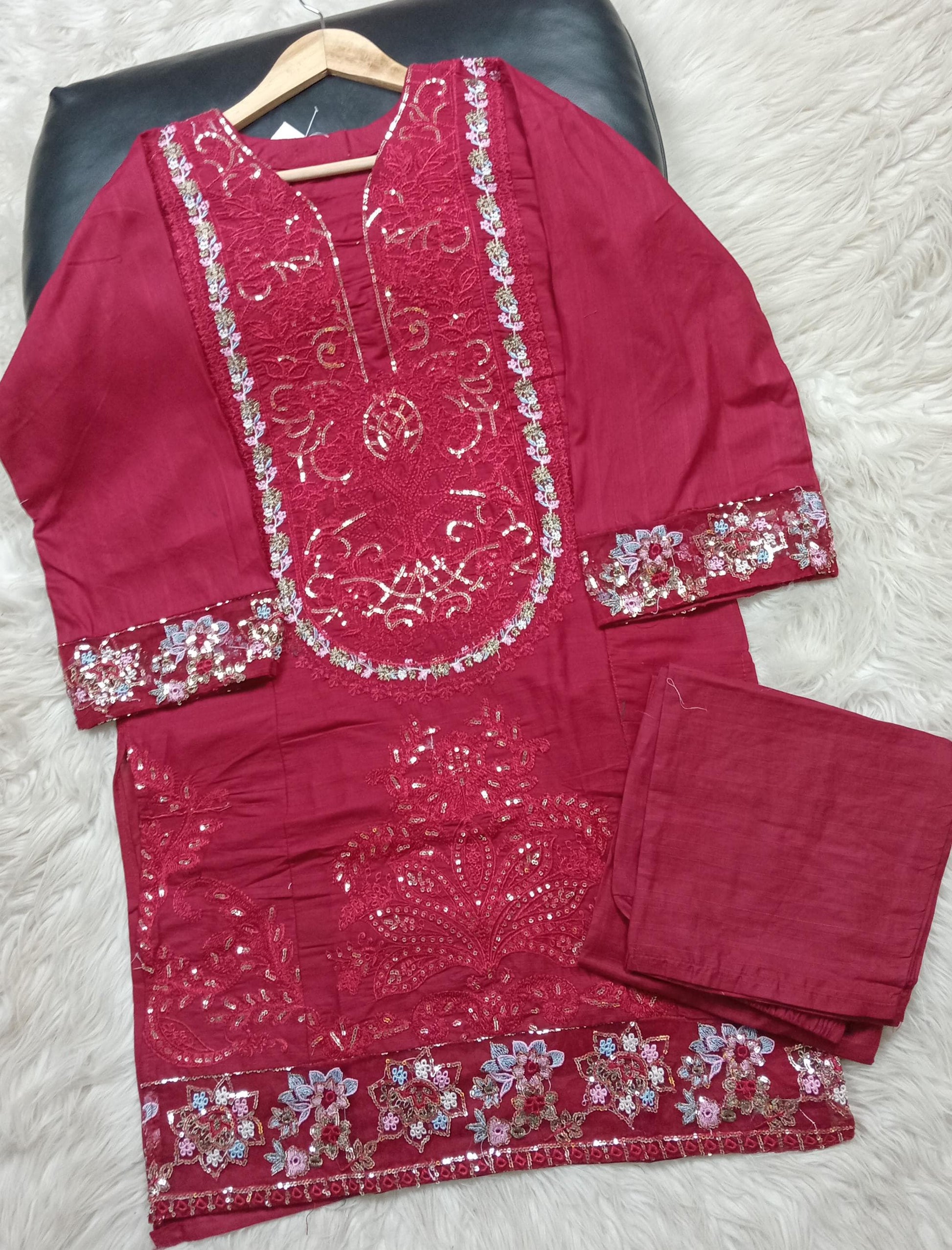 Embroidered front with embroidered Panel, Plain Back Panel, Ban With A Placket And Bot Neckline, Full Sleeves, full size plain trouser and dupatta
