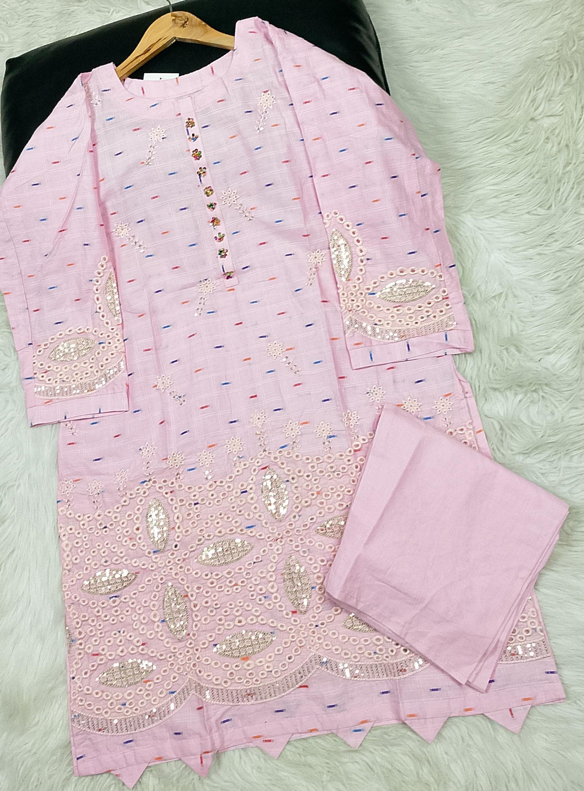 Embroidered front with embroidered Panel, Plain Back Panel, Ban With A Placket And Bot Neckline, Full Sleeves, full size plain trouser and dupatta