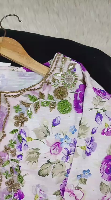 Embroidered front with embroidered Panel, Plain Back Panel, Ban With A Placket And Bot Neckline, Full Sleeves, full size plain trouser and dupatta