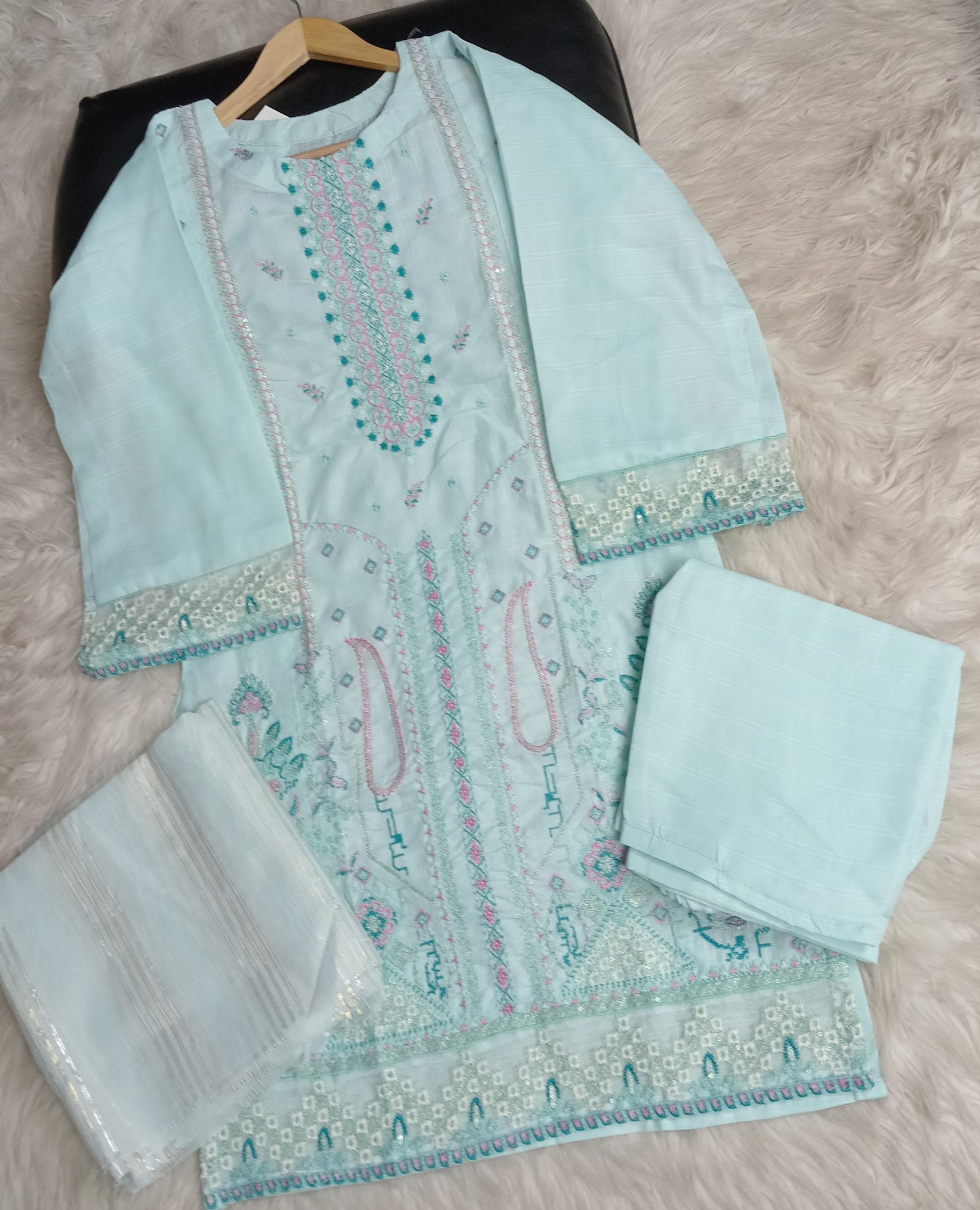 Embroidered front with embroidered Panel, Plain Back Panel, Ban With A Placket And Bot Neckline, Full Sleeves, full size plain trouser and dupatta