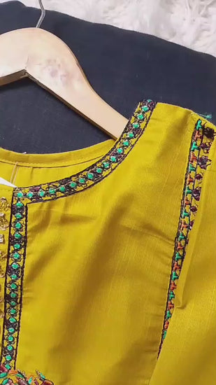 Embroidered front with embroidered Panel, Plain Back Panel, Ban With A Placket And Bot Neckline, Full Sleeves, full size plain trouser and dupatta