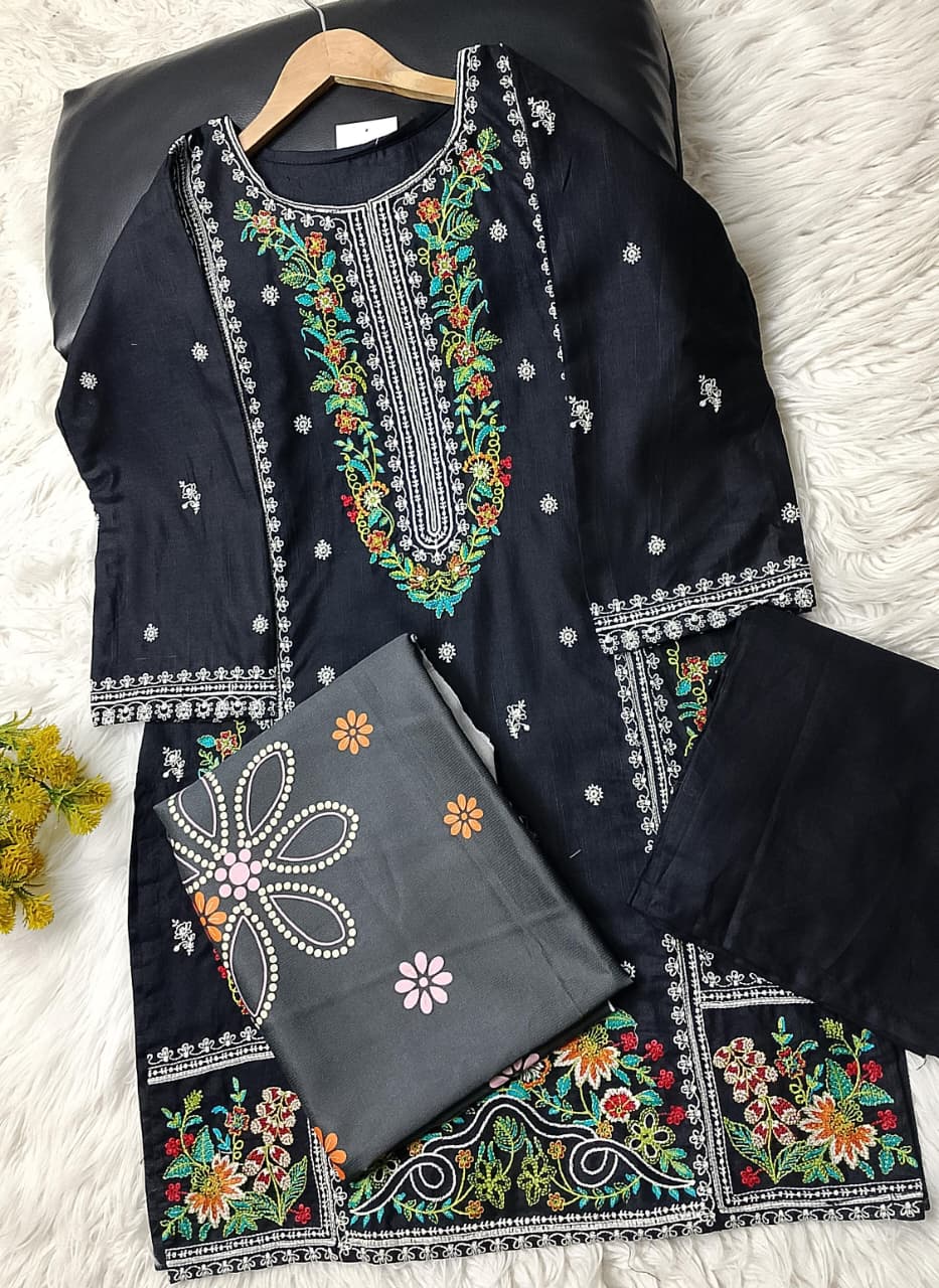 Embroidered front with embroidered Panel, Plain Back Panel, Ban With A Placket And Bot Neckline, Full Sleeves, full size plain trouser and dupatta
