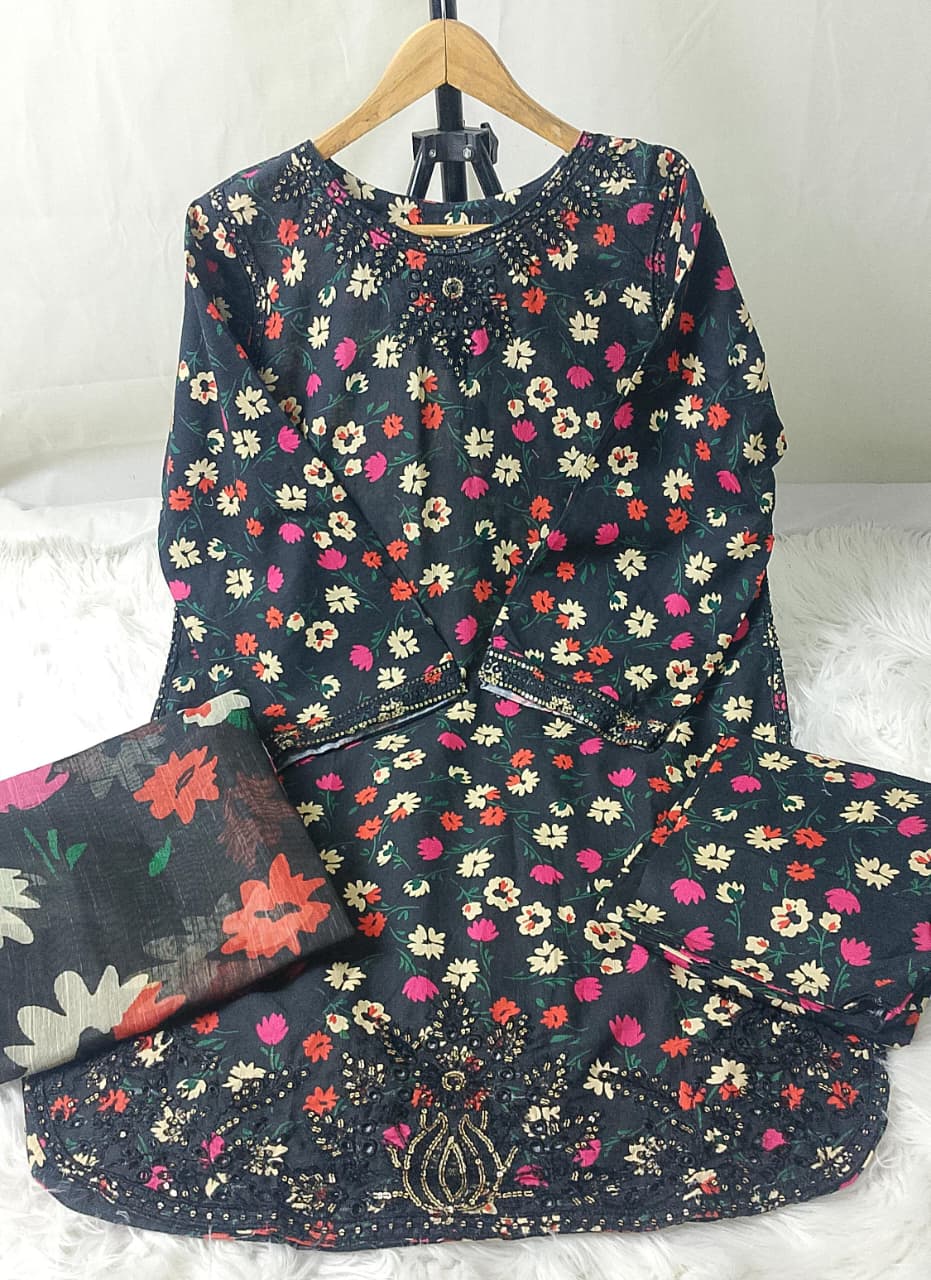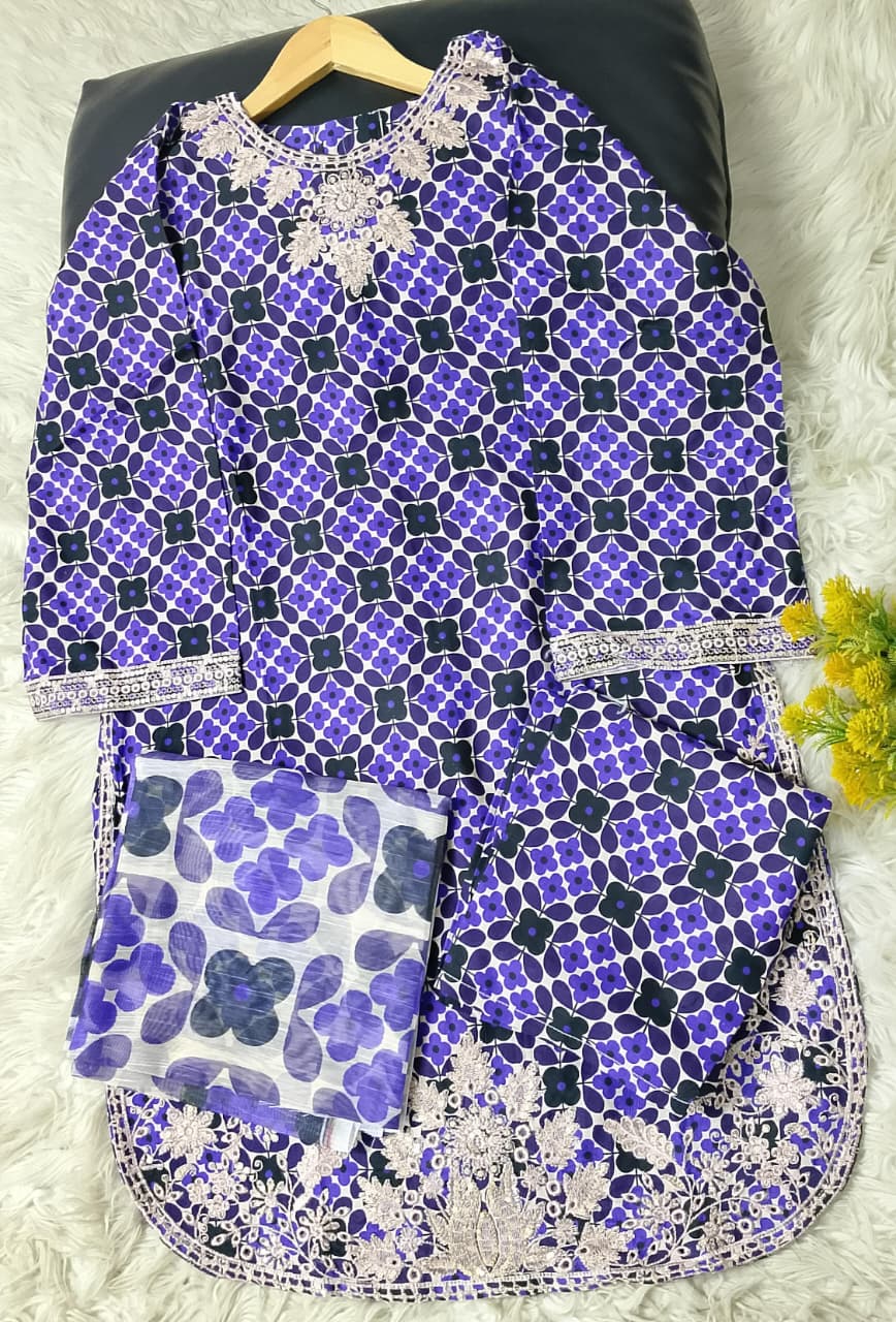 Printed front with embroidered Panel, Printed Back Panel, Ban With A Placket And Bot Neckline, Full Sleeves, printed trouser and dupatta