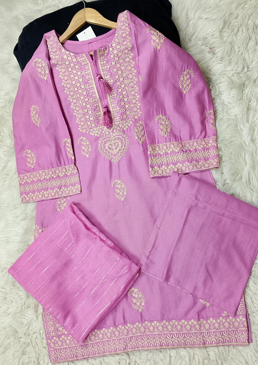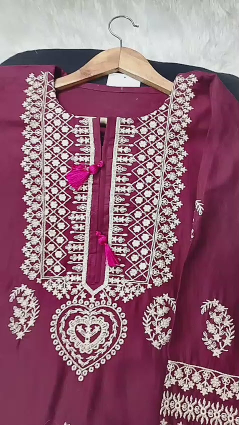 Embroidered front with embroidered Panel, Plain Back Panel, Ban With A Placket And Bot Neckline, Full Sleeves, full size plain trouser and dupatta