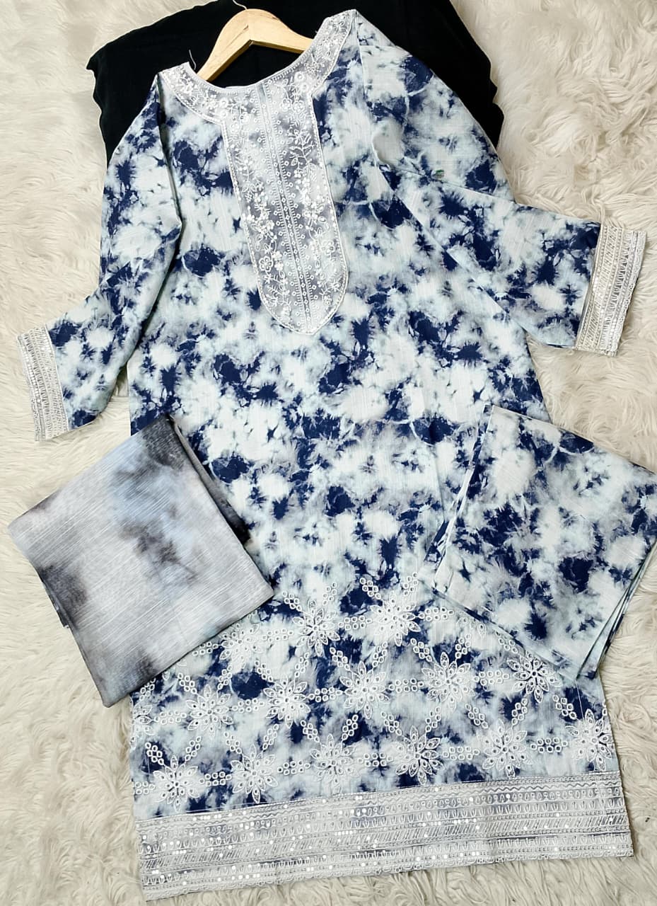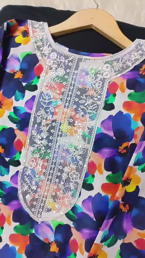 Printed front with embroidered Panel, Printed Back Panel, Ban With A Placket And Bot Neckline, Full Sleeves, printed trouser and dupatta
