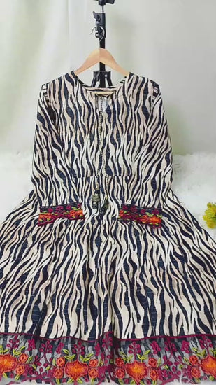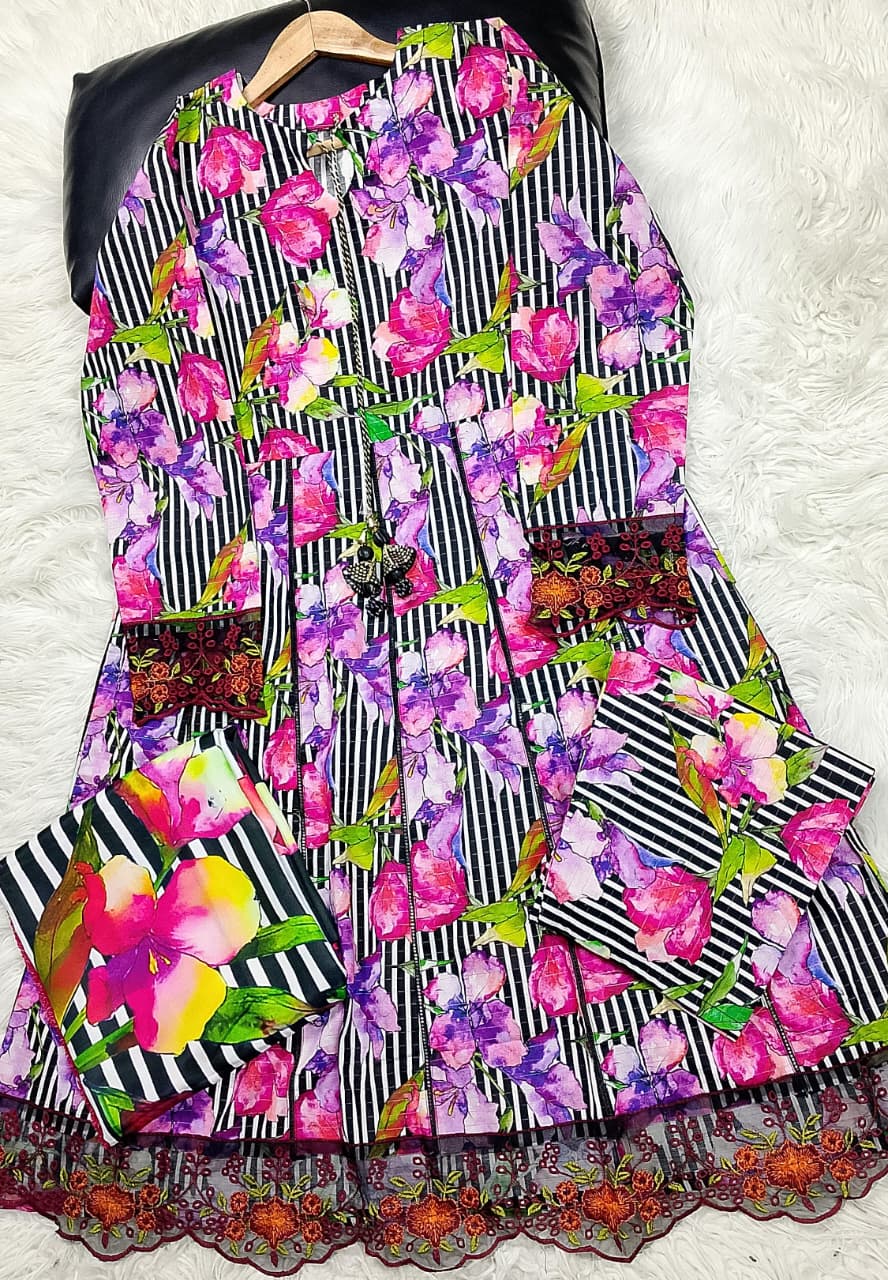 Printed front with embroidered Panel, Printed Back Panel, Ban With A Placket And Bot Neckline, Full Sleeves, printed trouser and dupatta