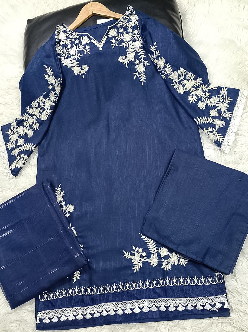 Embroidered front with embroidered Panel, Plain Back Panel, Ban With A Placket And Bot Neckline, Full Sleeves, full size plain trouser and dupatta