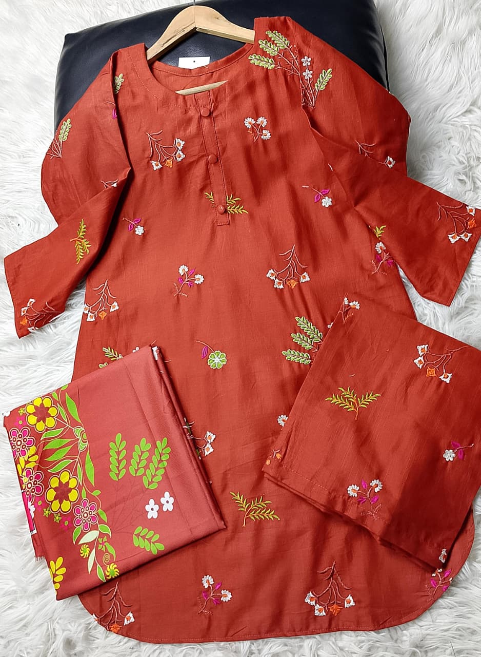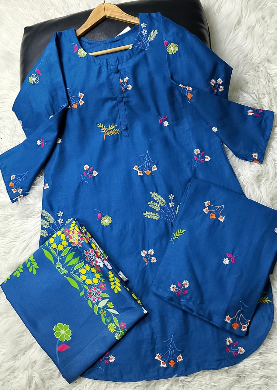 Embroidered front with embroidered Panel, Plain Back Panel, Ban With A Placket And Bot Neckline, Full Sleeves, full size plain trouser and dupatta