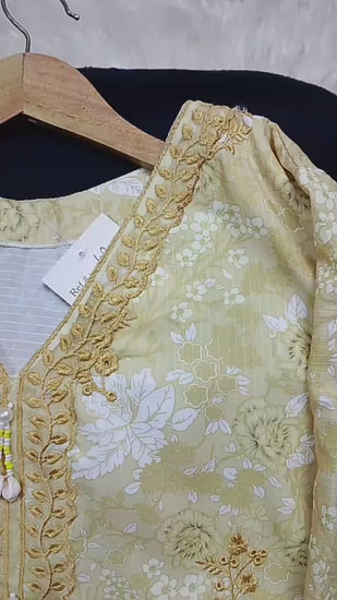 Embroidered front with embroidered Panel, Plain Back Panel, Ban With A Placket And Bot Neckline, Full Sleeves, full size plain trouser and dupatta
