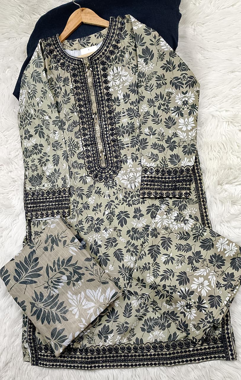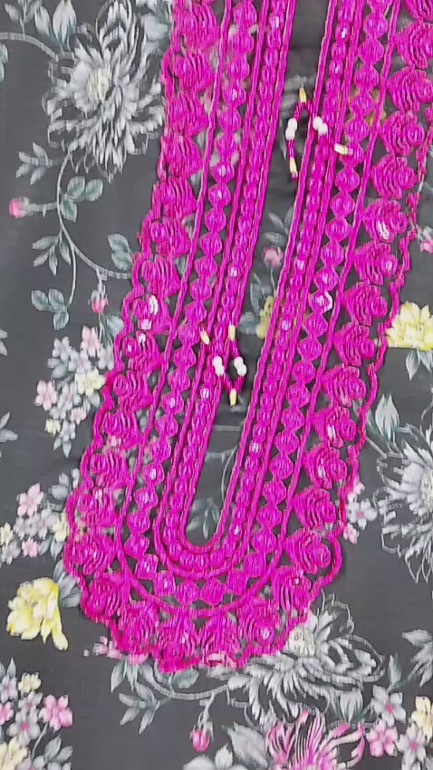 Embroidered front with embroidered Panel, Plain Back Panel, Ban With A Placket And Bot Neckline, Full Sleeves, full size plain trouser and dupatta