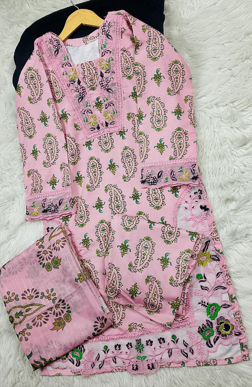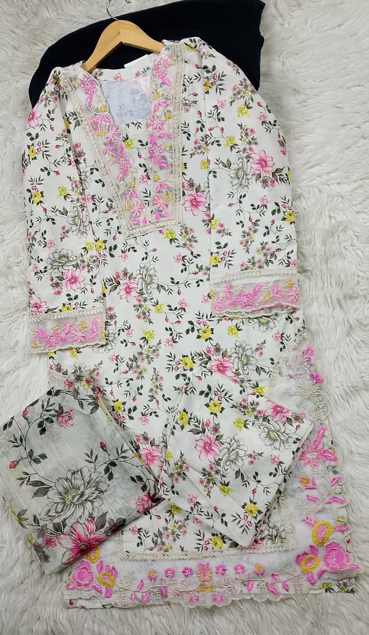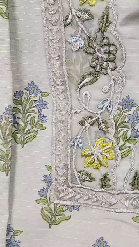 Embroidered front with embroidered Panel, Plain Back Panel, Ban With A Placket And Bot Neckline, Full Sleeves, full size plain trouser and dupatta
