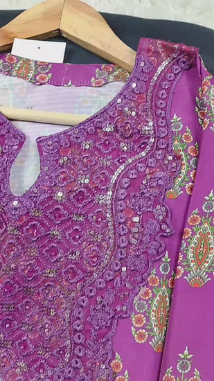 Embroidered front with embroidered Panel, Plain Back Panel, Ban With A Placket And Bot Neckline, Full Sleeves, full size plain trouser and dupatta