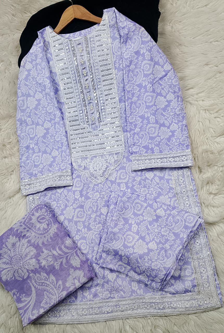 Embroidered front with embroidered Panel, Plain Back Panel, Ban With A Placket And Bot Neckline, Full Sleeves, full size plain trouser and dupatta