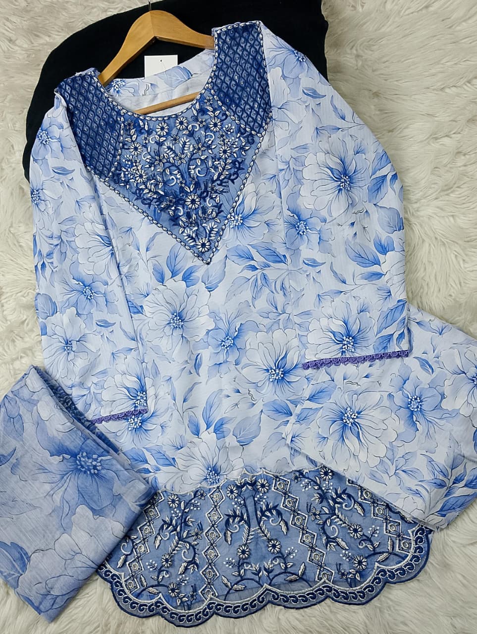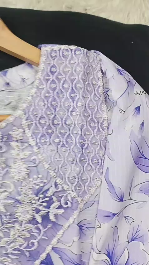 Embroidered front with embroidered Panel, Plain Back Panel, Ban With A Placket And Bot Neckline, Full Sleeves, full size plain trouser and dupatta