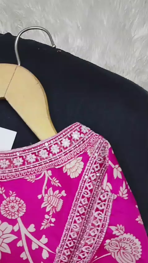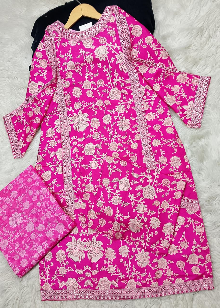 Embroidered front with embroidered Panel, Plain Back Panel, Ban With A Placket And Bot Neckline, Full Sleeves, full size plain trouser and dupatta