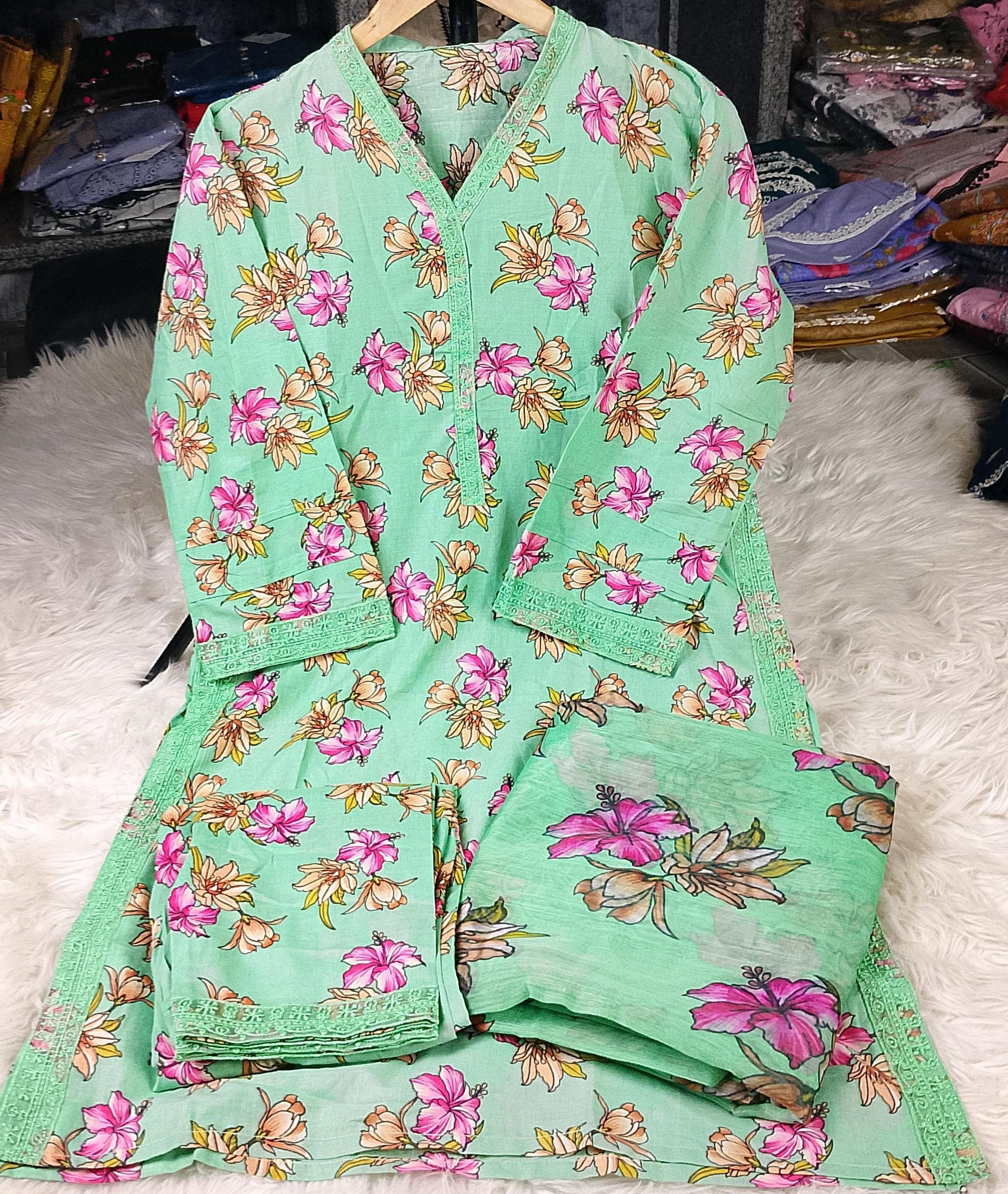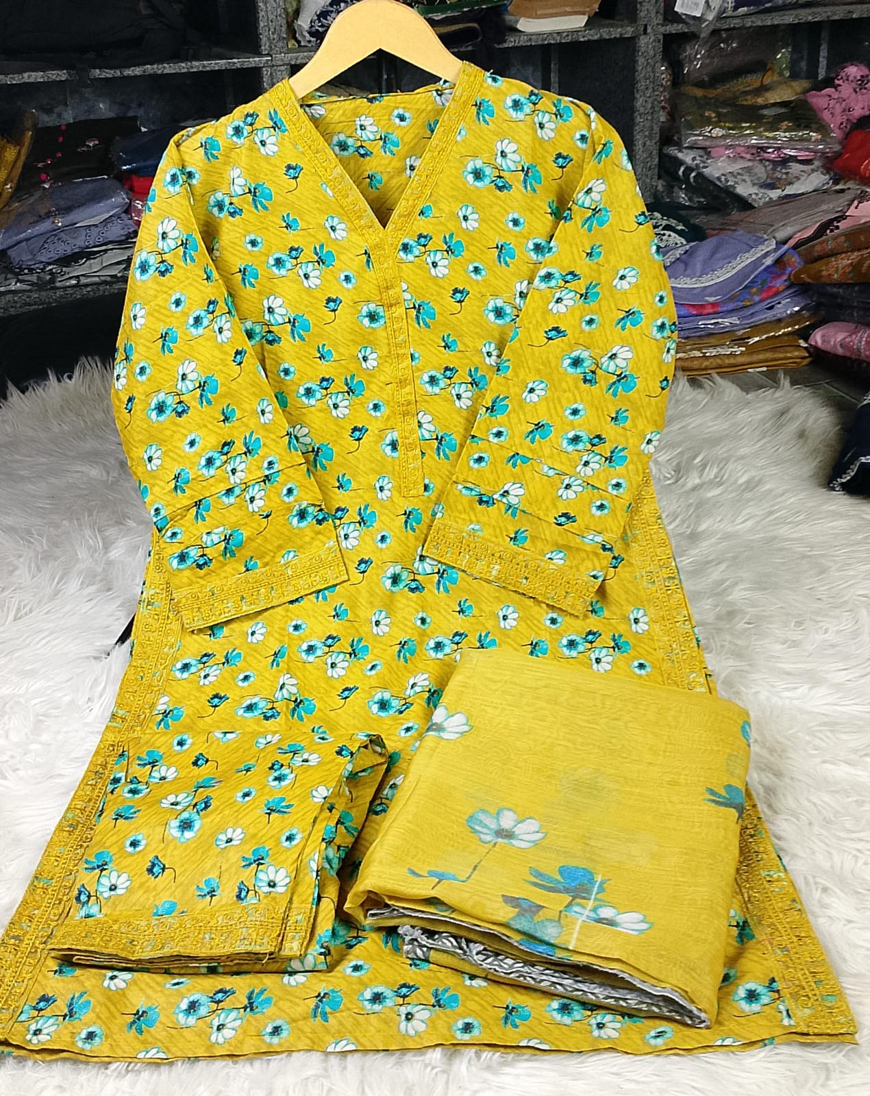 Printed / Embroidered front with embroidered Panel, Plain Back Panel, Ban With A Placket And Bot Neckline, Full Sleeves, full size plain trouser and dupatta