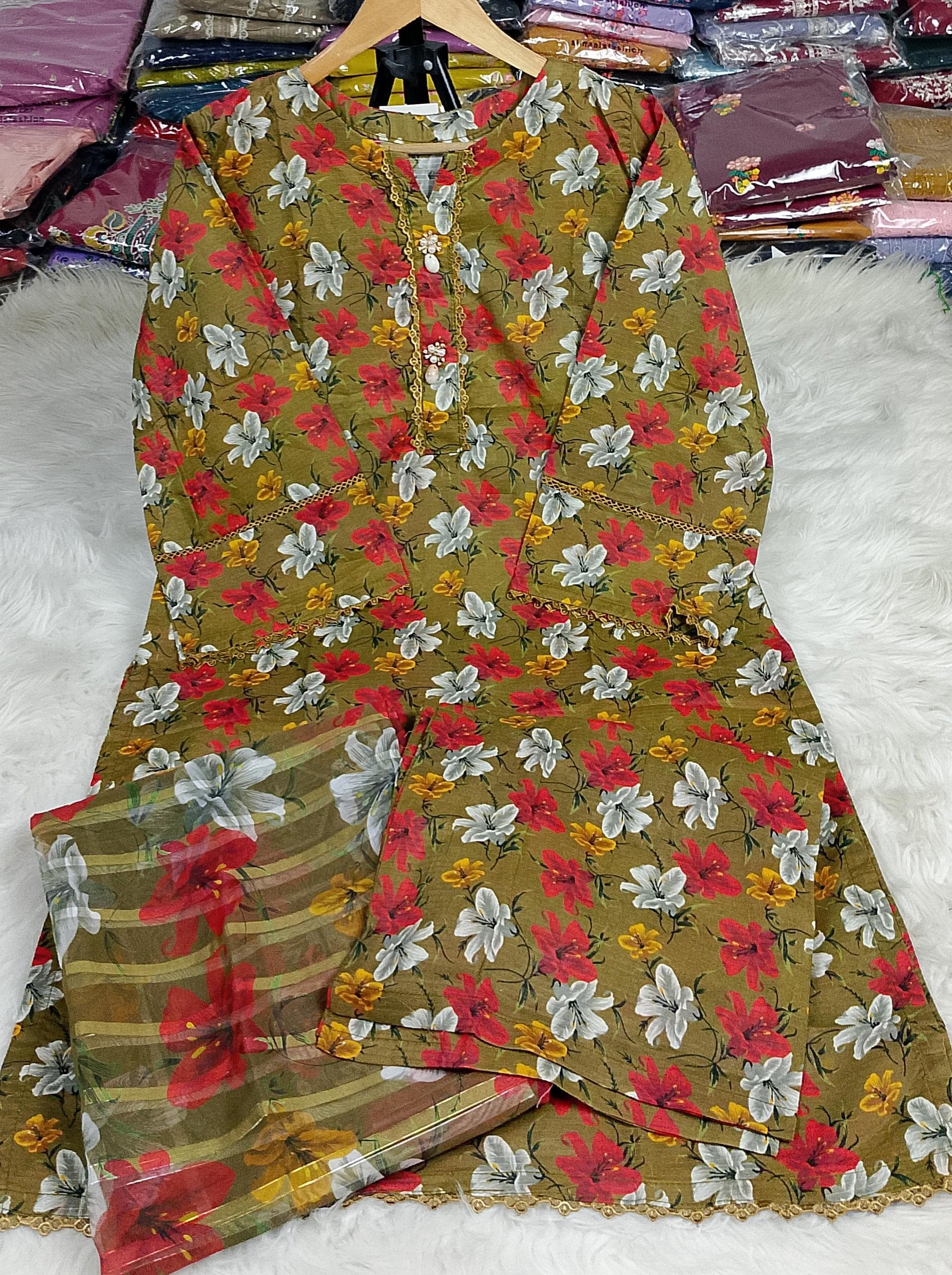 Printed / Embroidered front with embroidered Panel, Plain Back Panel, Ban With A Placket And Bot Neckline, Full Sleeves, full size plain trouser and dupatta