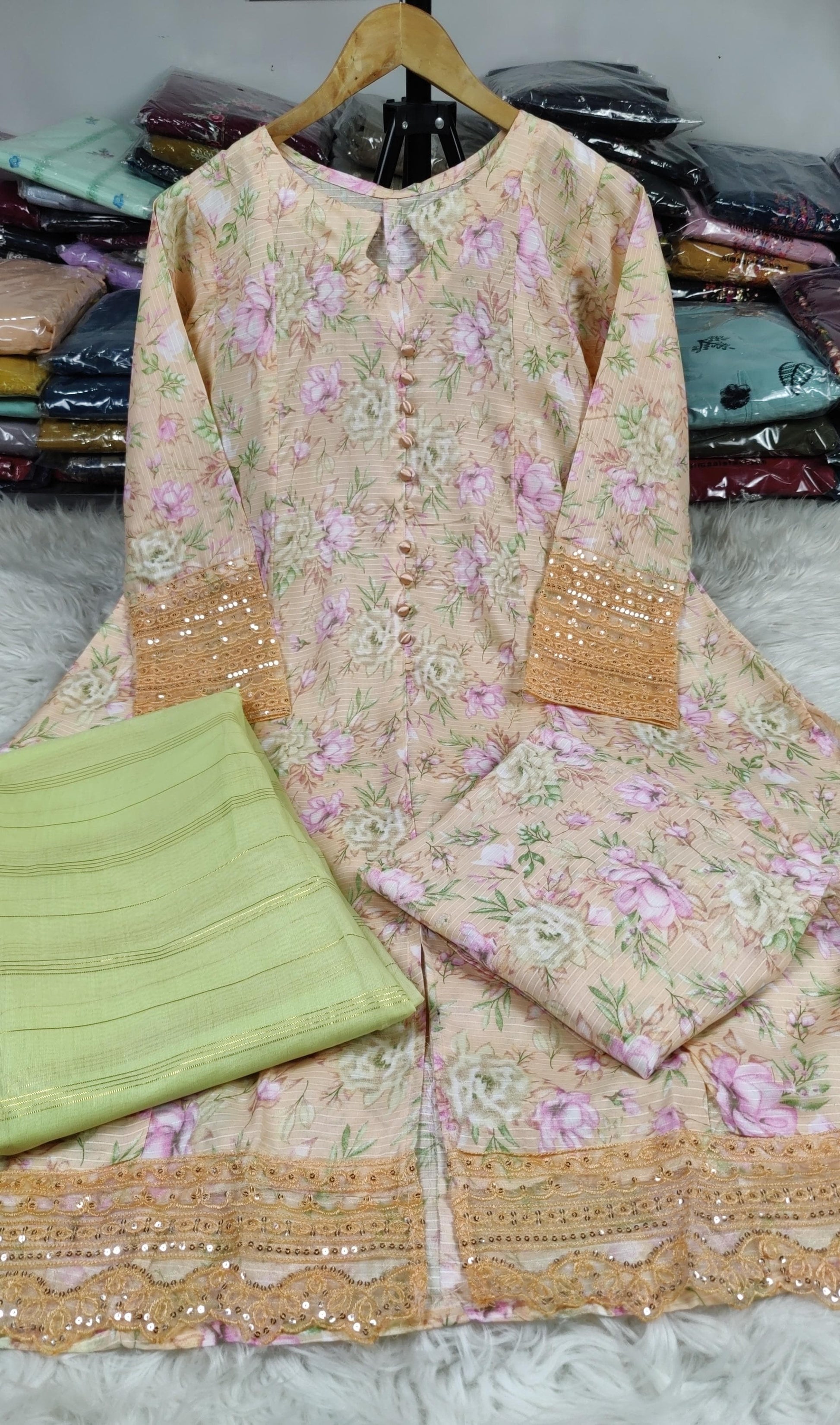 Printed / Embroidered front with embroidered Panel, Plain Back Panel, Ban With A Placket And Bot Neckline, Full Sleeves, full size plain trouser and dupatta