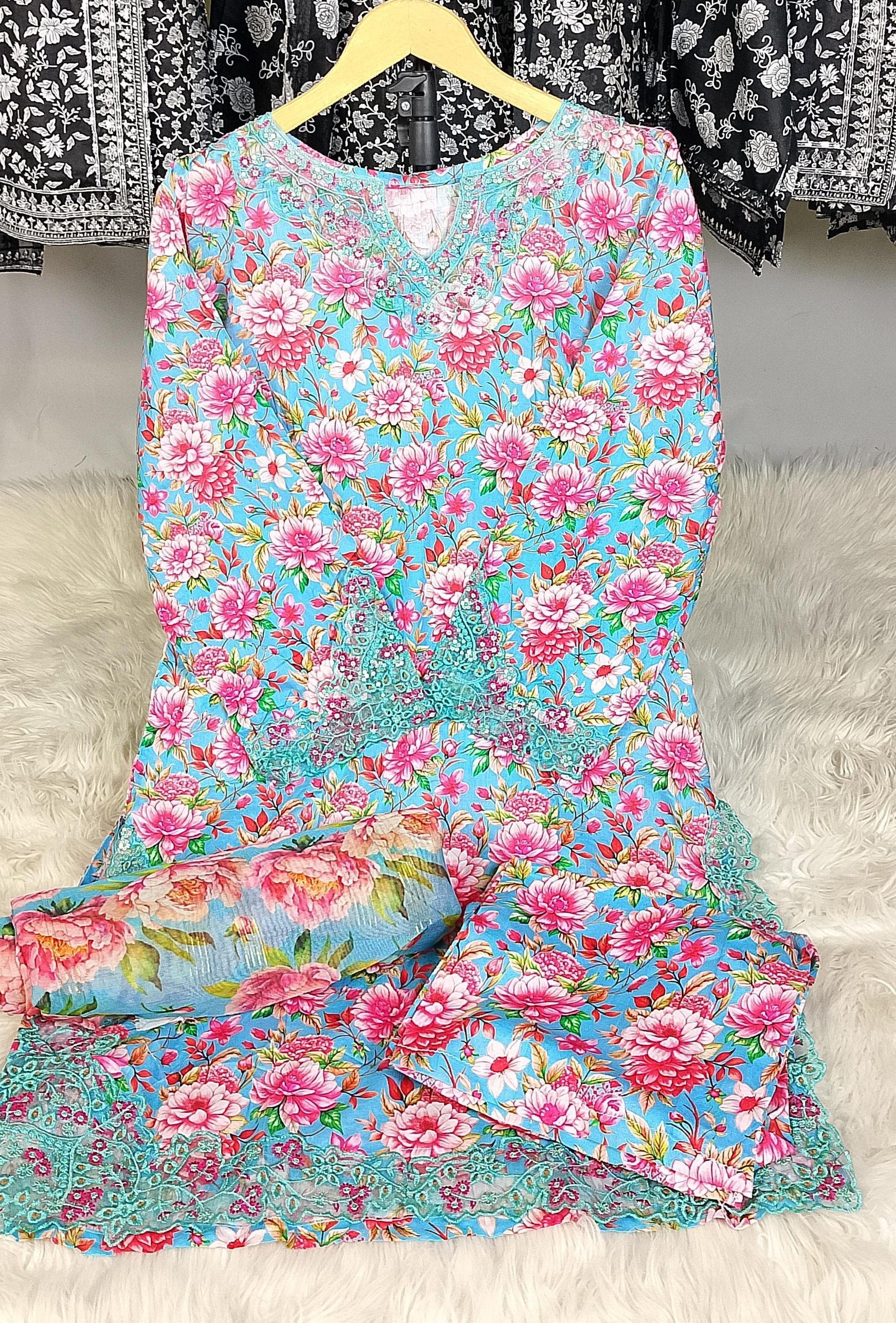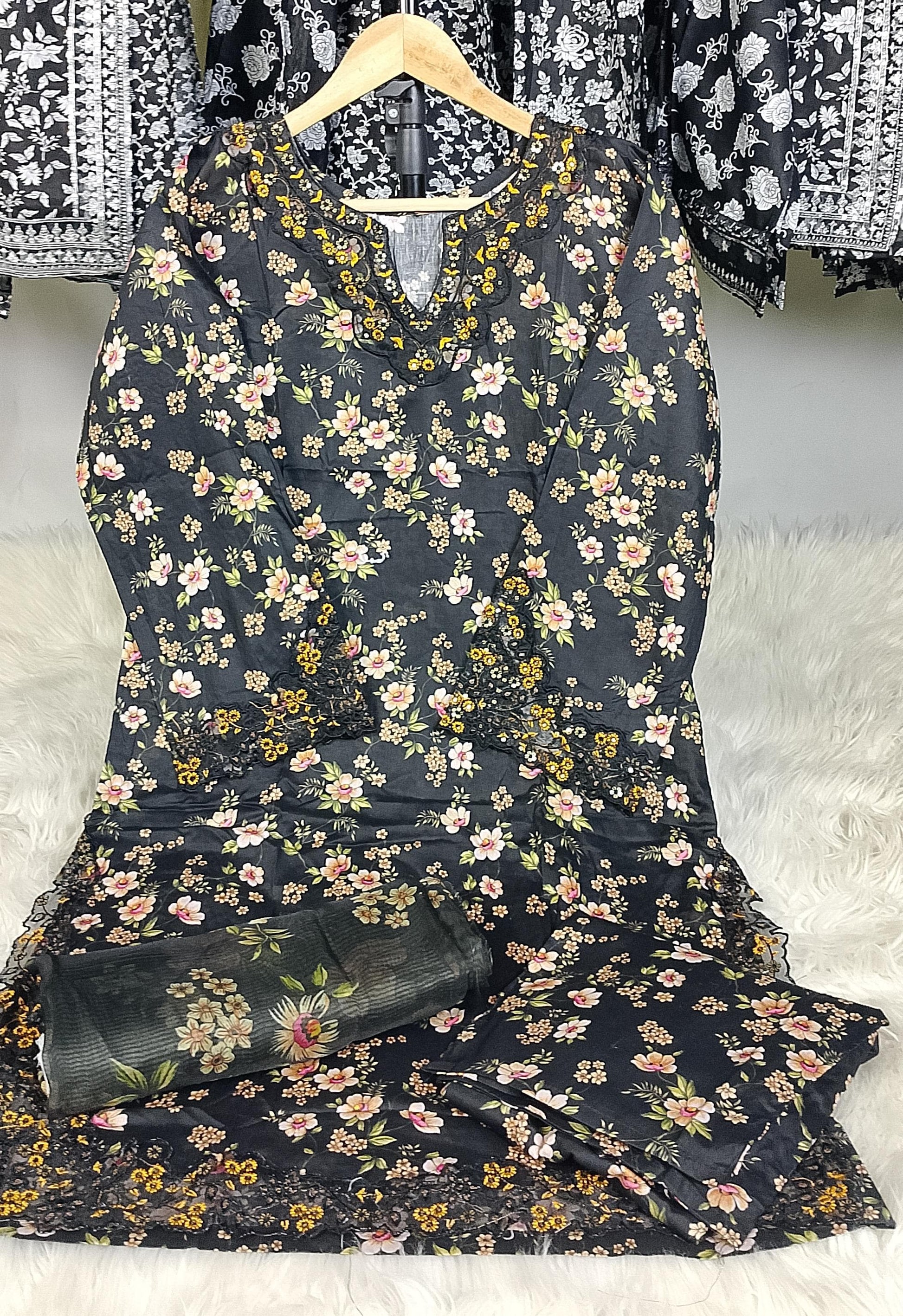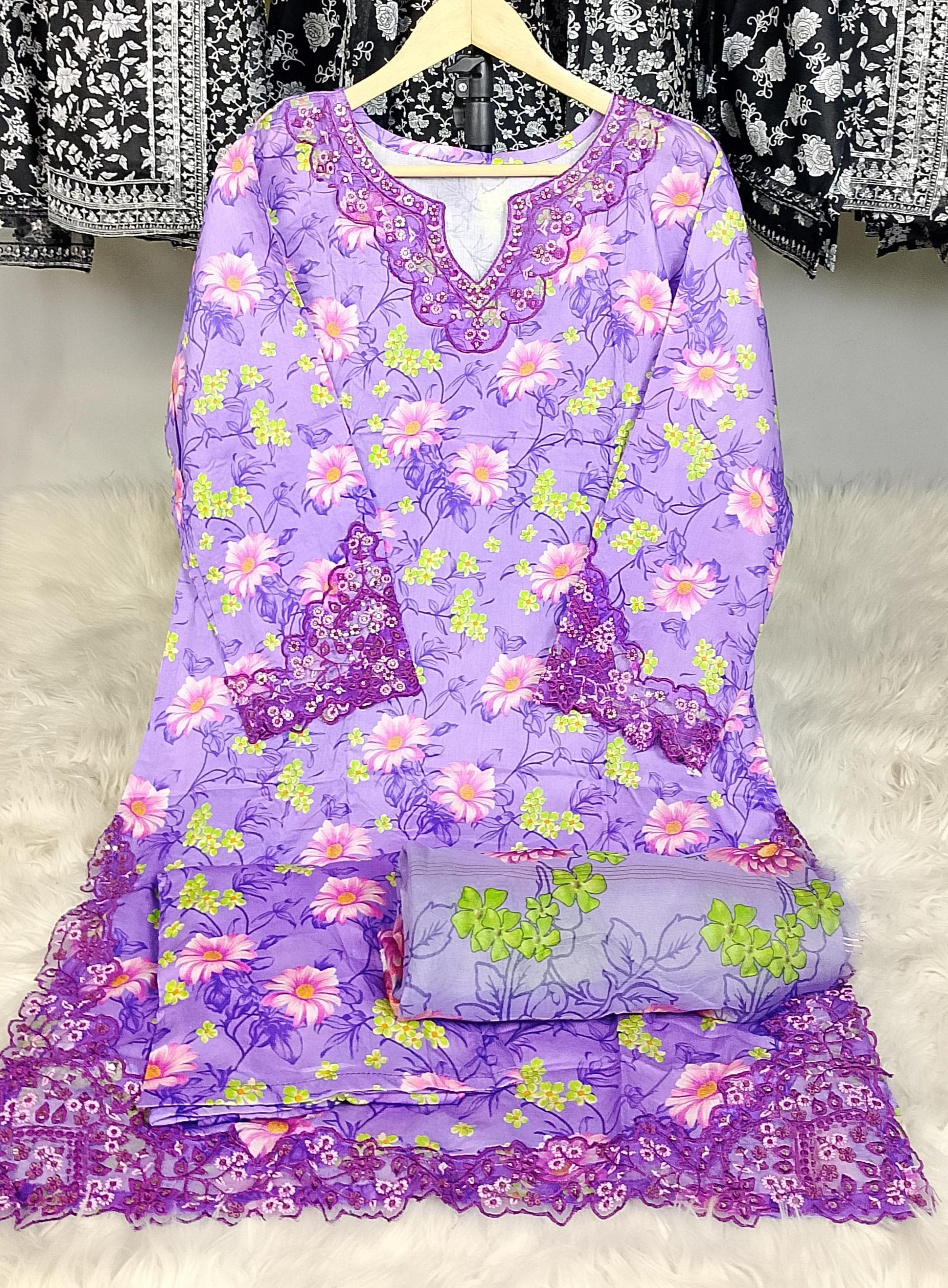 Printed / Embroidered front with embroidered Panel, Plain Back Panel, Ban With A Placket And Bot Neckline, Full Sleeves, full size plain trouser and dupatta