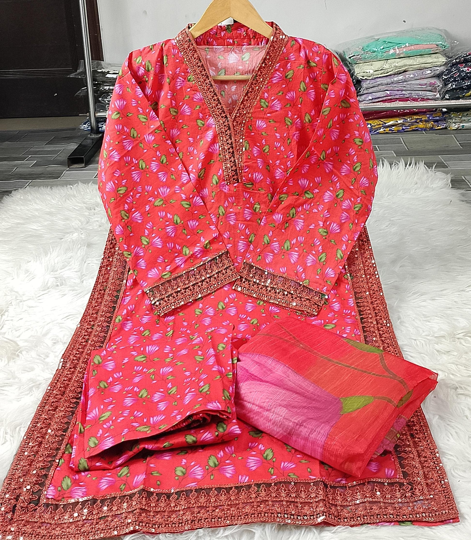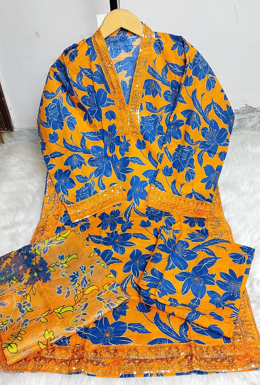 Printed / Embroidered front with embroidered Panel, Plain Back Panel, Ban With A Placket And Bot Neckline, Full Sleeves, full size plain trouser and dupatta