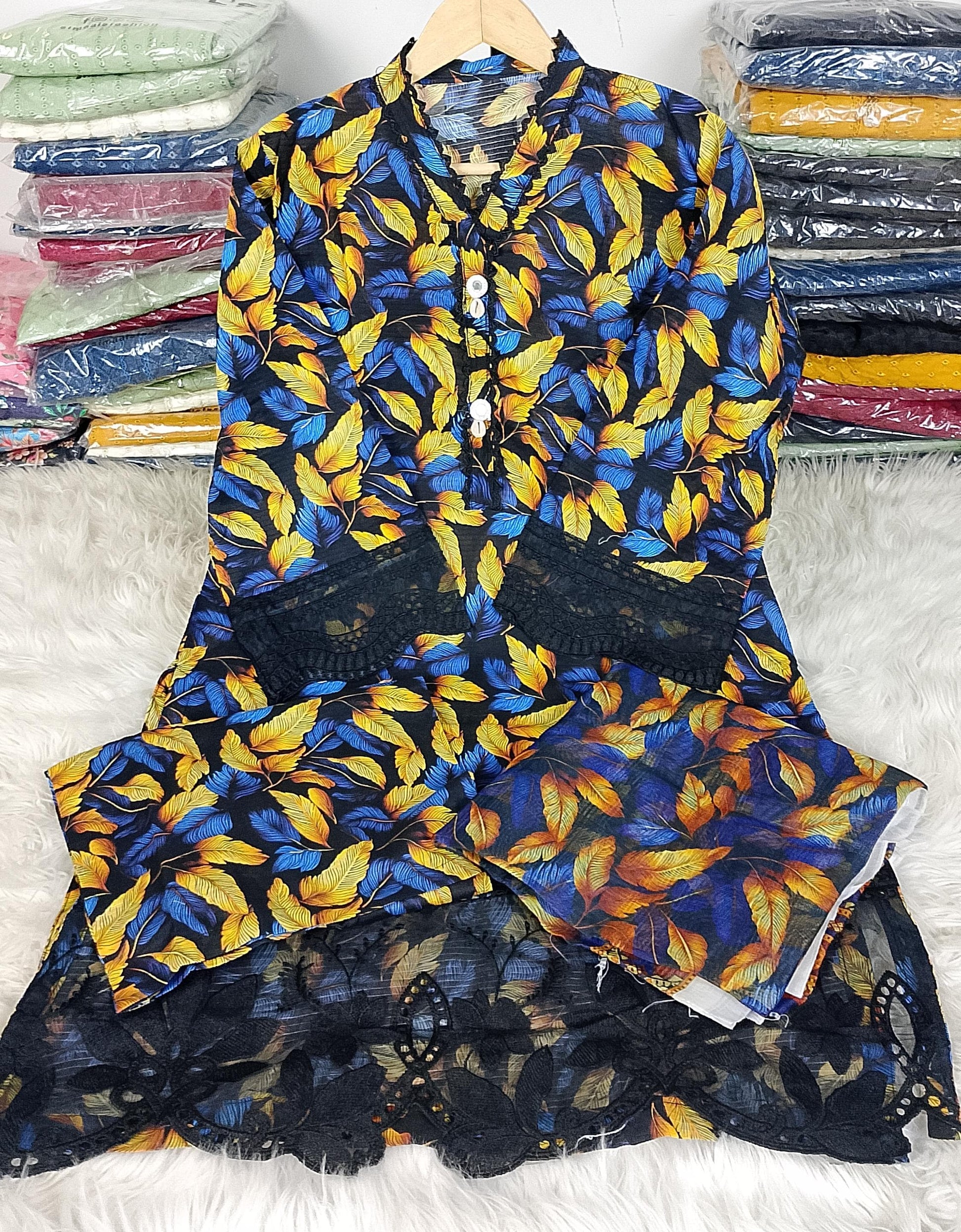 Printed / Embroidered front with embroidered Panel, Plain Back Panel, Ban With A Placket And Bot Neckline, Full Sleeves, full size plain trouser and dupatta