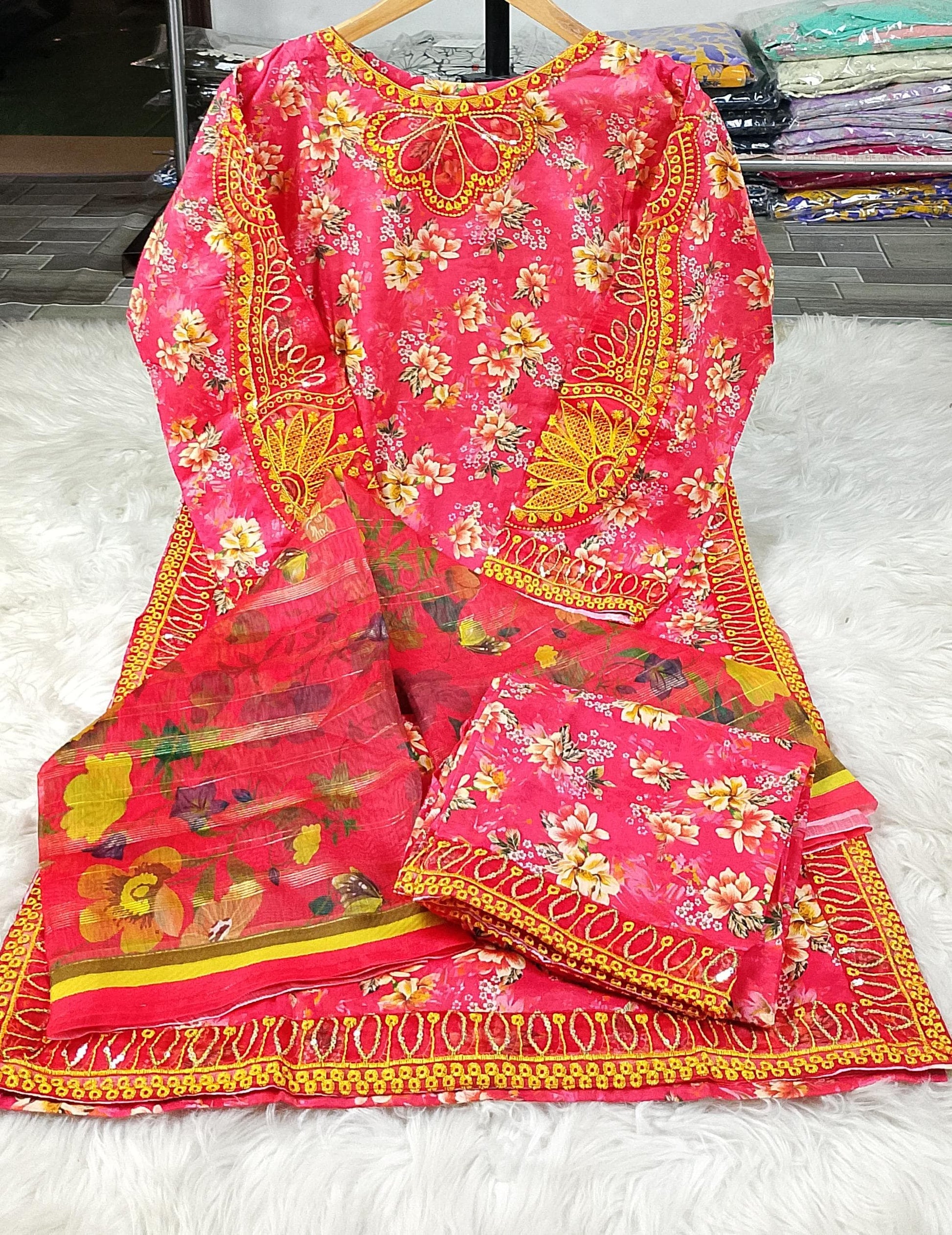 Printed / Embroidered front with embroidered Panel, Plain Back Panel, Ban With A Placket And Bot Neckline, Full Sleeves, full size plain trouser and dupatta
