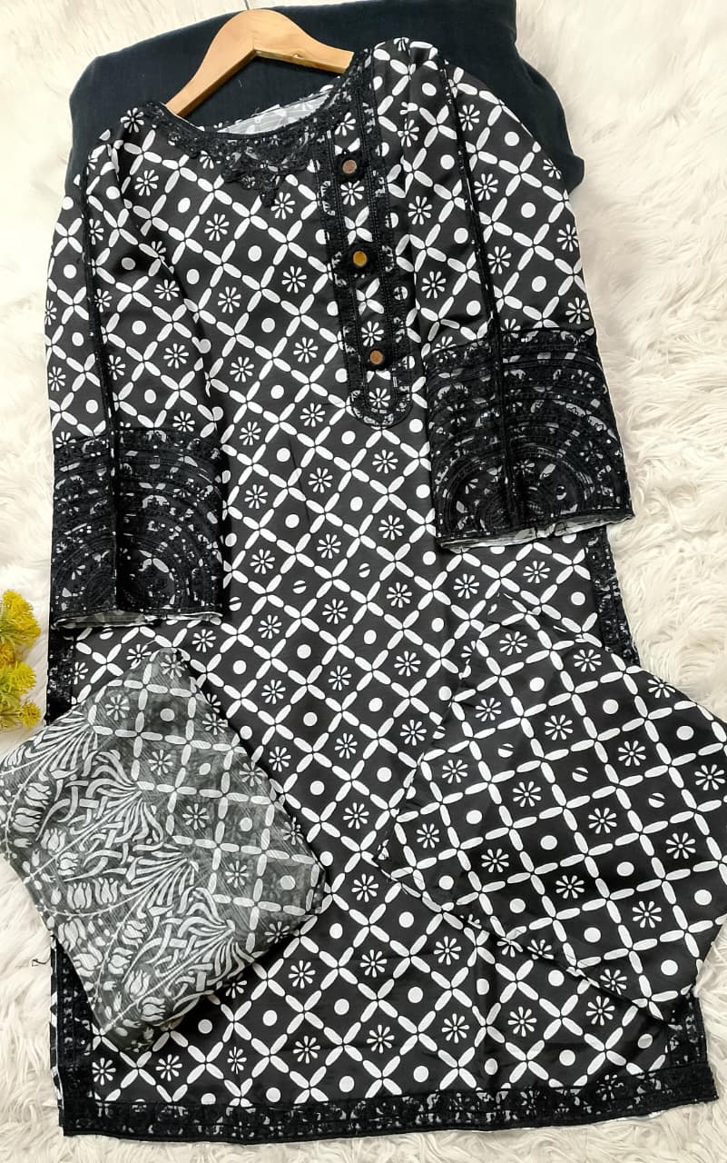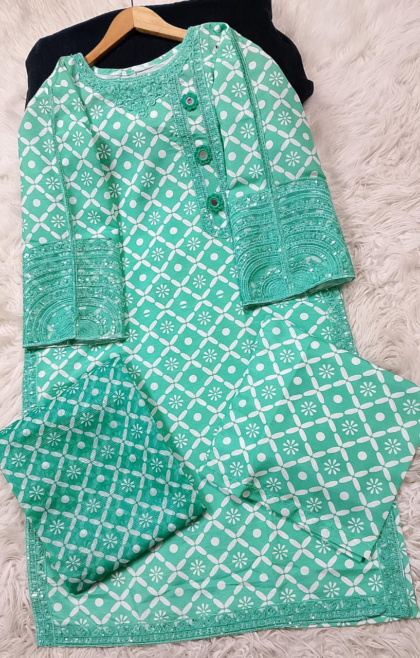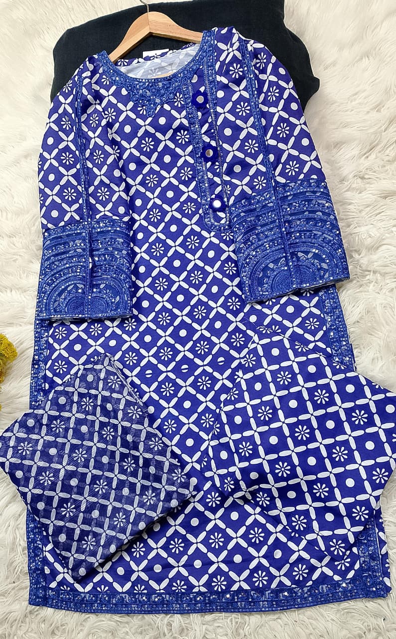 Printed / Embroidered front with embroidered Panel, Plain Back Panel, Ban With A Placket And Bot Neckline, Full Sleeves, full size plain trouser and dupatta