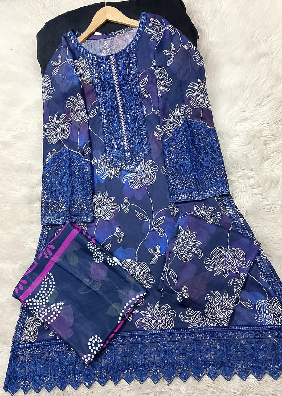 Printed / Embroidered front with embroidered Panel, Plain Back Panel, Ban With A Placket And Bot Neckline, Full Sleeves, full size plain trouser and dupatta